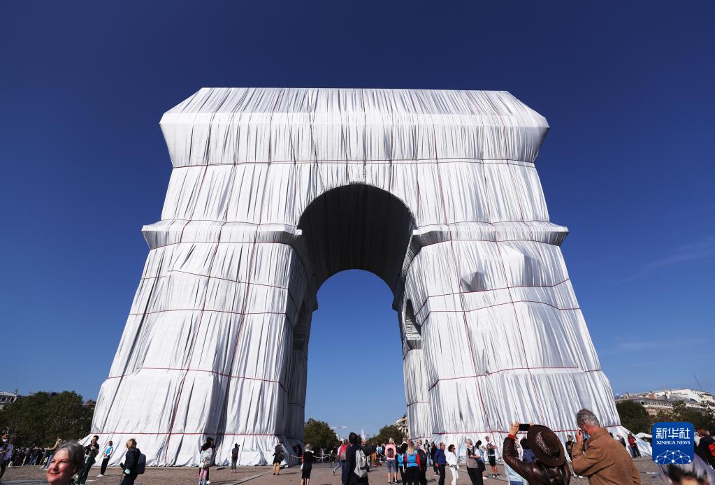 這是9月21日在法國巴黎拍攝的“被包裹的凱旋門”。 “被包裹的凱旋門”是保加利亞已故藝術家赫里斯托和妻子讓娜-克洛德的遺作。根據他們的構思,巴黎地標建筑凱旋門被可回收的織物包裹起來。目前,凱旋門已被2.5萬平方米藍銀色可回收織物“包裹”,并用3000米紅繩固定。“被包裹的凱旋門”藝術展于18日正式向公眾開放,10月3日結束。新華社記者高靜攝
