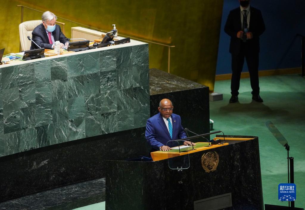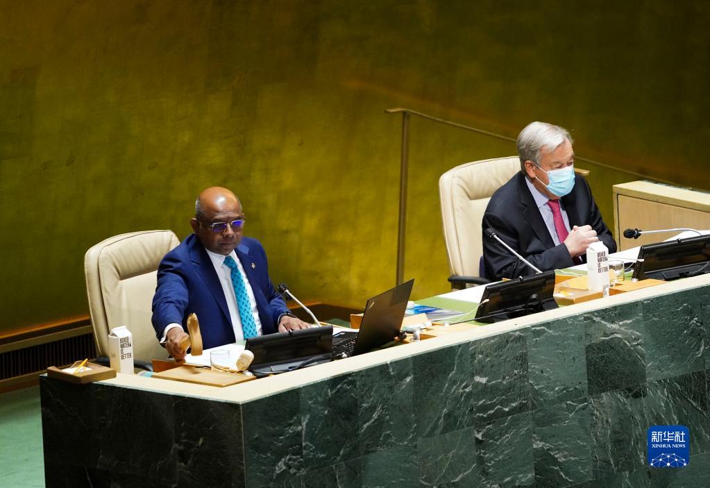 9月21日,在位于紐約的聯合國總部,第76屆聯合國大會主席阿卜杜拉·沙希德(左)主持聯合國大會一般性辯論開幕式。 第76屆聯合國大會一般性辯論21日在紐約聯合國總部拉開帷幕。100多位國家元首、政府首腦和高級代表將以視頻或現場發言方式就新冠疫情、氣候危機、可持續復蘇、人道主義形勢等人類共同面臨的重大挑戰探討應對之策。 新華社記者王迎攝