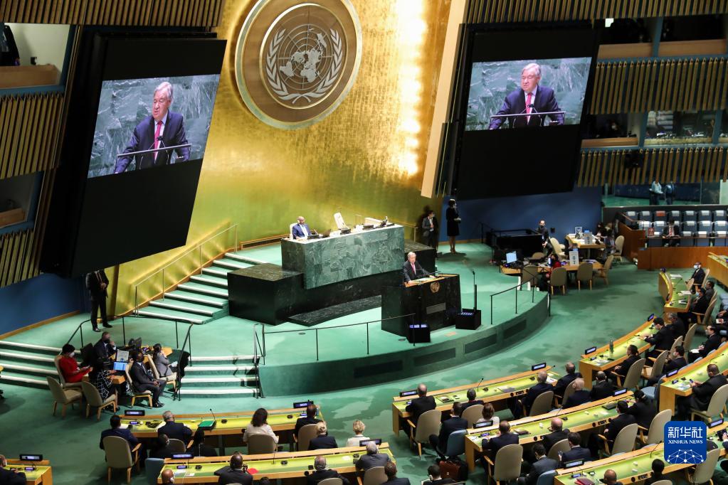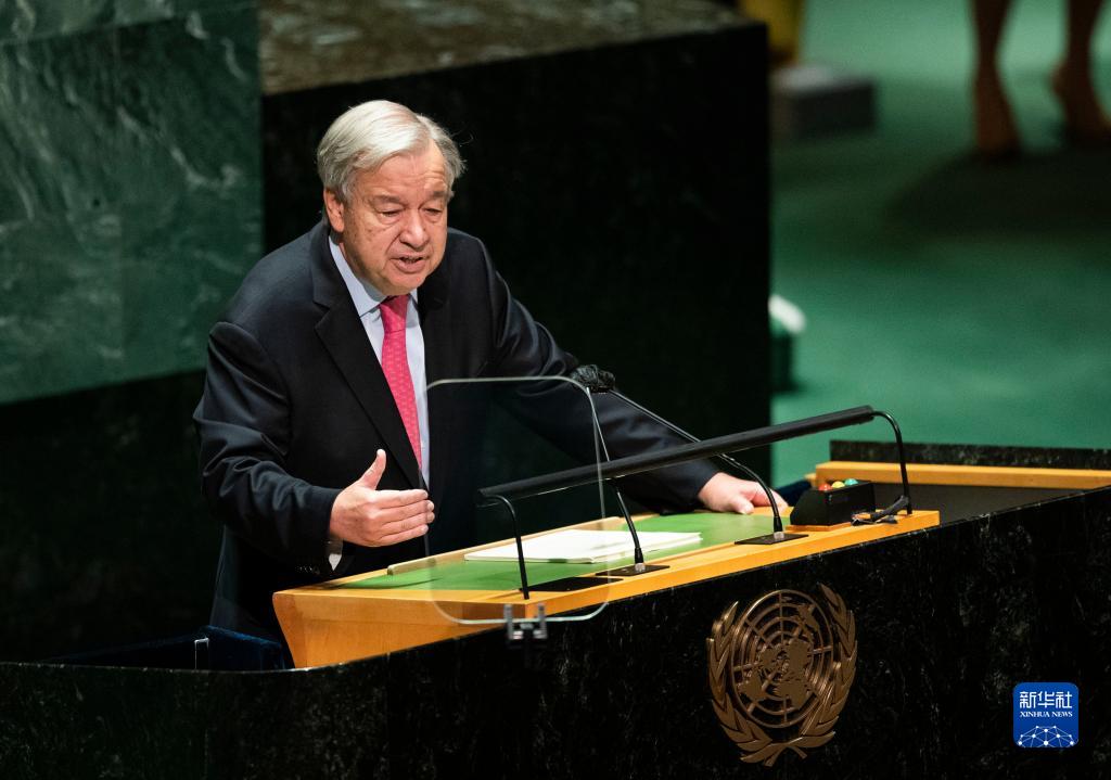 9月21日,在位于紐約的聯合國總部,聯合國秘書長古特雷斯在第76屆聯合國大會一般性辯論開幕式上致辭。 第76屆聯合國大會一般性辯論21日在紐約聯合國總部拉開帷幕。100多位國家元首、政府首腦和高級代表將以視頻或現場發言方式就新冠疫情、氣候危機、可持續復蘇、人道主義形勢等人類共同面臨的重大挑戰探討應對之策。 新華社記者王迎攝