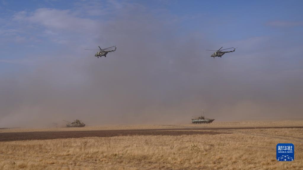 9月23日,在俄羅斯奧倫堡州東古茲靶場舉行的“和平使命-2021”上海合作組織聯合反恐軍事演習實兵實彈演習中,多國聯合部隊進行陸空協同作戰。新華社記者 梅世雄 攝 |