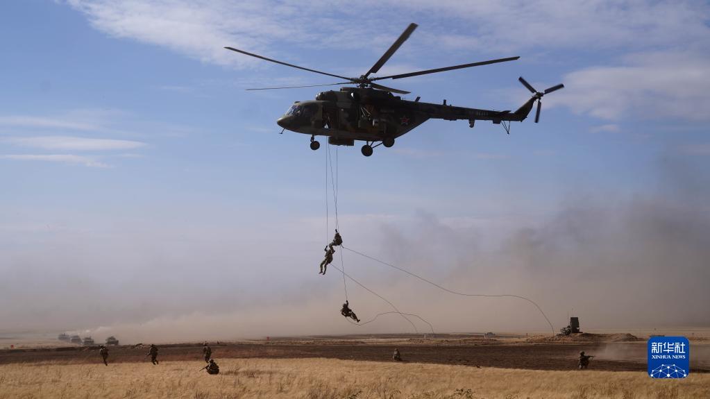 9月23日,在俄羅斯奧倫堡州東古茲靶場舉行的“和平使命-2021”上海合作組織聯合反恐軍事演習實兵實彈演習中,多國聯合部隊特戰分隊執行索降作戰任務。新華社記者 梅世雄 攝 “恐怖武裝”集中主要兵力發起進攻,企圖消滅多國聯合部隊裝甲分隊。多國聯合部隊趁“恐怖武裝”立足未穩,使用強大的空中火力進行突擊。隨即,特戰小隊實施快速索降,引誘“恐怖武裝”對多國聯合部隊實施追擊。多國聯合部隊火力對“恐怖武裝”后方實施攔阻射擊,斷“恐怖武裝”后路。 在偵察引導隊的引導下,中方參演部隊地面突擊群指揮員、北部戰區某旅合成一營營長闞金柱命令第一突擊隊迅速占領防御陣地,完成防御部署。