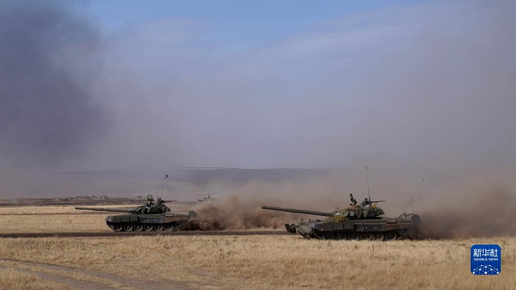 9月23日,在俄羅斯奧倫堡州東古茲靶場舉行的“和平使命-2021”上海合作組織聯合反恐軍事演習實兵實彈演習中,多國聯合部隊地面突擊群坦克部隊迅猛出擊。新華社記者 梅世雄 攝 在近一個小時演練時間內,各國參演部隊演練了封鎖誘騙、火力打擊、 防御戰斗、進攻戰斗、追擊行動5個戰斗階段。 一望無際的東古茲草原,鋪展開一幅壯闊的秋日演兵圖。