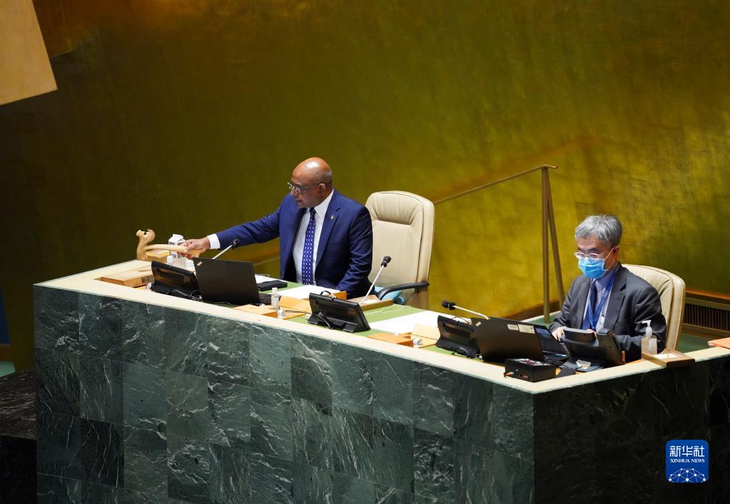 9月27日,在位于紐約的聯(lián)合國總部,第76屆聯(lián)合國大會主席沙希德(左)宣布一般性辯論閉幕。新華社記者 王迎 攝