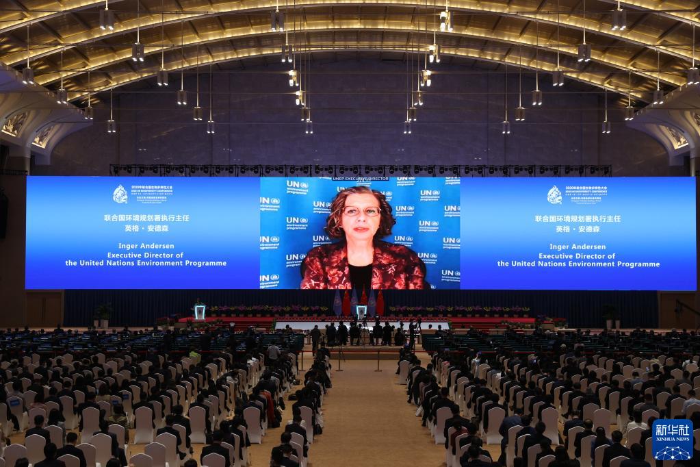 10月11日,《生物多樣性公約》第十五次締約方大會在云南昆明開幕。這是聯合國環境規劃署執行主任英格·安德森在開幕式上發表視頻致辭。 新華社記者 金立旺 攝