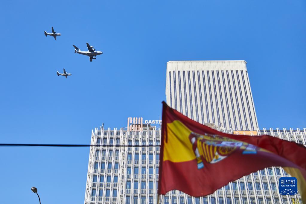 10月12日,空軍飛機在西班牙首都馬德里的國慶日慶?;顒由辖邮軝z閱。 當日,西班牙首都馬德里舉行活動,慶祝國慶日。 新華社記者 孟鼎博 攝 |