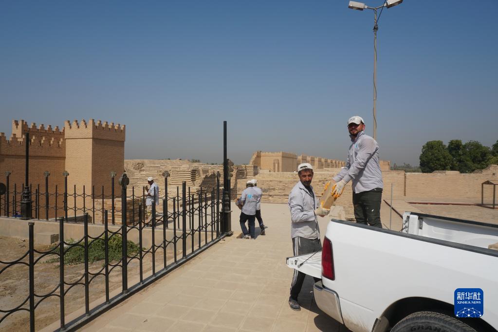 10月16日,文物修復人員在伊拉克巴比倫古城遺址搬運材料。