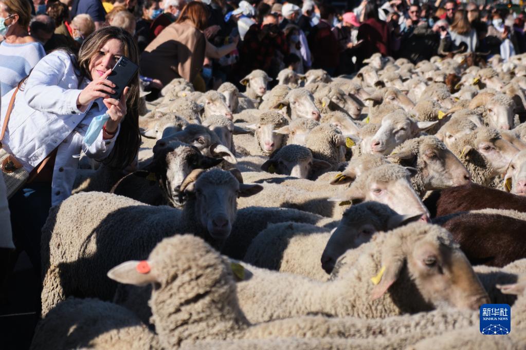 10月24日,一名女子與走過西班牙馬德里市中心的羊群合影。