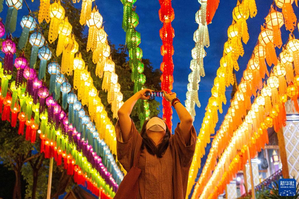 10月25日,游客在泰國(guó)南奔府哈利奔猜寺為各色燈籠拍照。