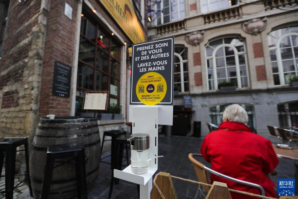 這是10月27日在比利時布魯塞爾的一家酒吧拍攝的提示顧客出示新冠通行證的標識和消毒液。 由于疫情反彈,比利時政府決定重新收緊防疫措施。比利時首相德克羅宣布,自29日起,比利時公共場所將要求戴口罩,酒吧、餐館和健身俱樂部的工作人員必須戴口罩;從下周開始,人們進入酒吧、餐館和健身俱樂部必須出示新冠通行證,證明持有者有以下三種情況之一:完成新冠疫苗全程接種;近期新冠病毒檢測結果為陰性;近期感染新冠后康復。 新華社記者 鄭煥松 攝