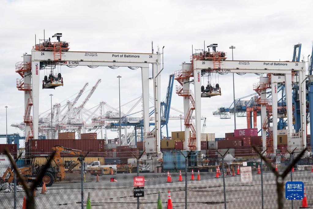 這是10月26日在美國馬里蘭州巴爾的摩市港口拍攝的貨運集裝箱和起重機。