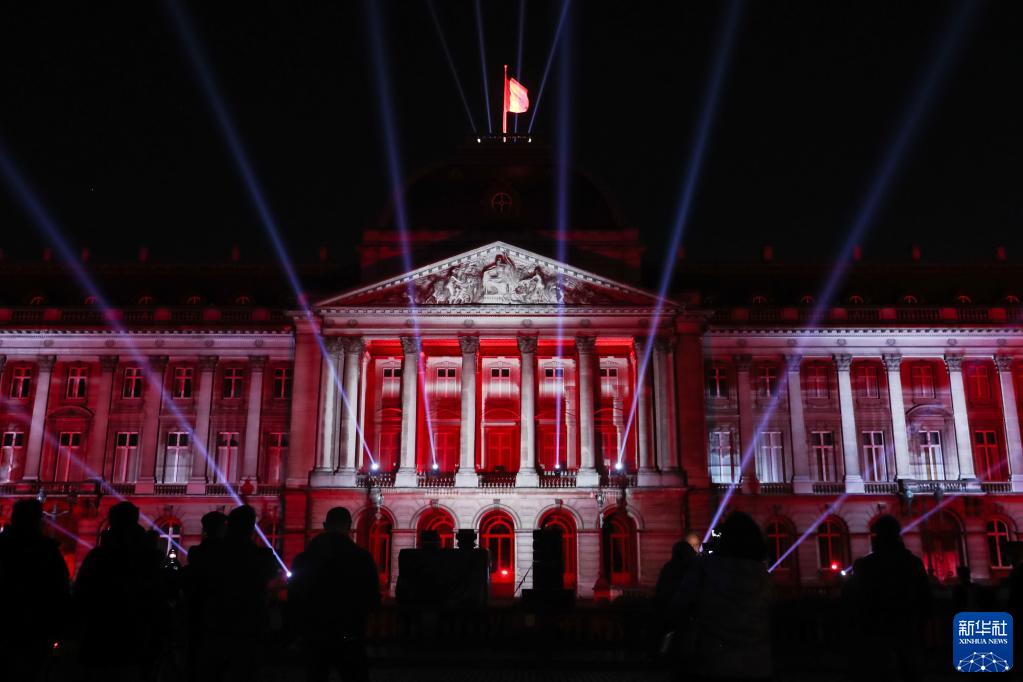10月28日,人們在比利時布魯塞爾王宮前體驗燈光節上的聲光秀。 當日,為期十天的布魯塞爾燈光節開幕,散布城中的十多處大型燈光藝術作品吸引觀眾體驗光影魅力。 新華社記者鄭煥松攝