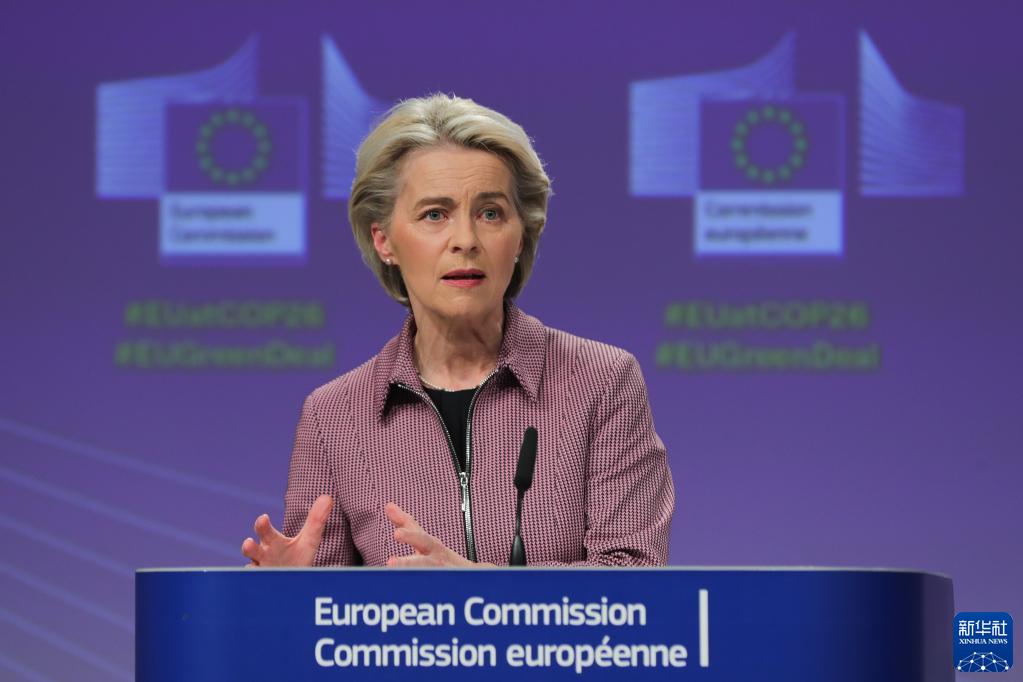 10月28日,歐盟委員會主席馮德萊恩在比利時布魯塞爾就二十國集團領導人意大利峰會和格拉斯哥聯合國氣候變化大會舉行新聞發布會。新華社記者鄭煥松攝