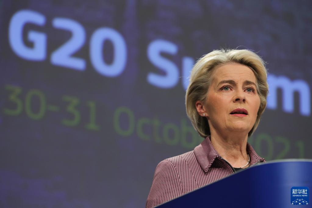 10月28日,歐盟委員會主席馮德萊恩在比利時布魯塞爾就二十國集團領導人意大利峰會和格拉斯哥聯合國氣候變化大會舉行新聞發布會。新華社記者鄭煥松攝