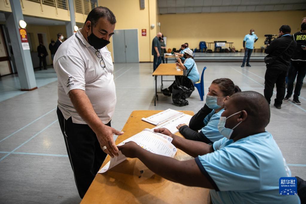 11月1日,在南非開普敦一處投票站,選民從工作人員手中接過選票。