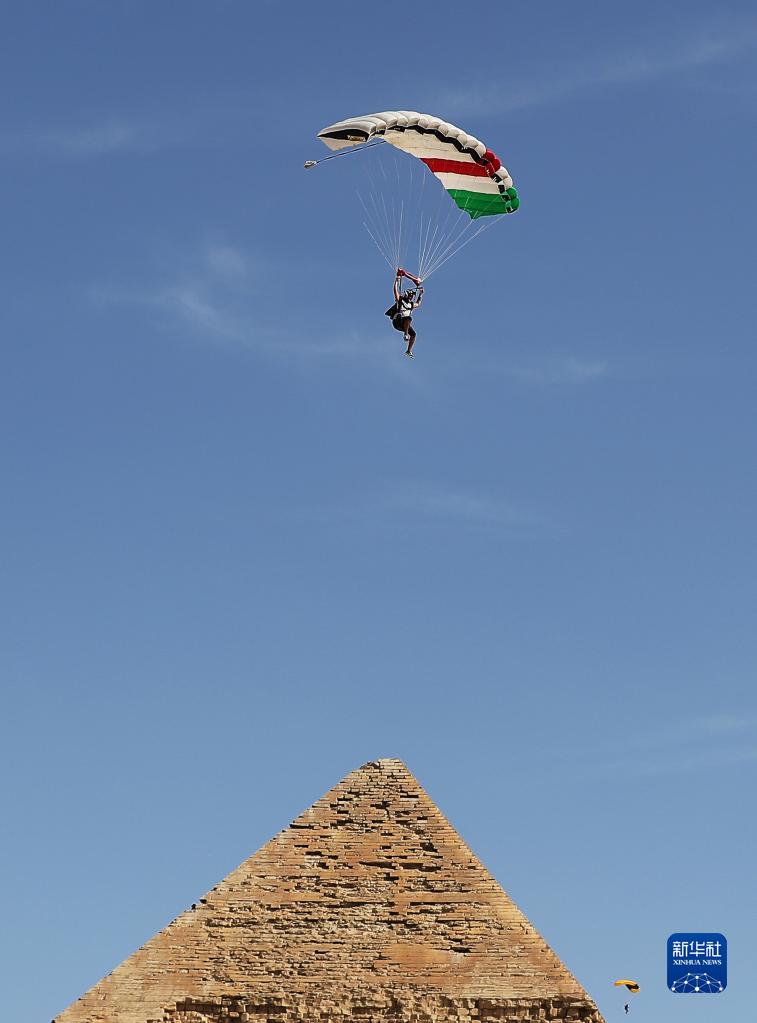 11月1日,在埃及吉薩金字塔景區,運動員進行跳傘表演。