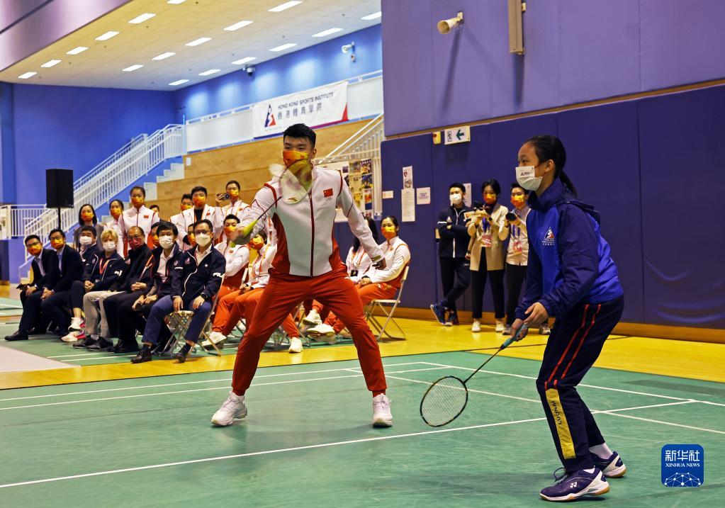 12月5日,內(nèi)地奧運健兒訪港代表團成員王懿律(前左)與香港體院青年運動員切磋球技。 當日,內(nèi)地奧運健兒訪港代表團部分成員來到香港體院,參觀訓練設施并與香港運動員交流互動。 新華社記者 賈浩成 攝