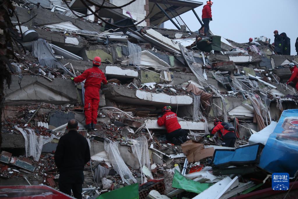 2月7日,在土耳其南部卡赫拉曼馬拉什市市中心,救援人員在搜救。卡赫拉曼馬拉什市是本次地震重災區卡赫拉曼馬拉什省省會,是遭受地震破壞最為嚴重的城市之一。