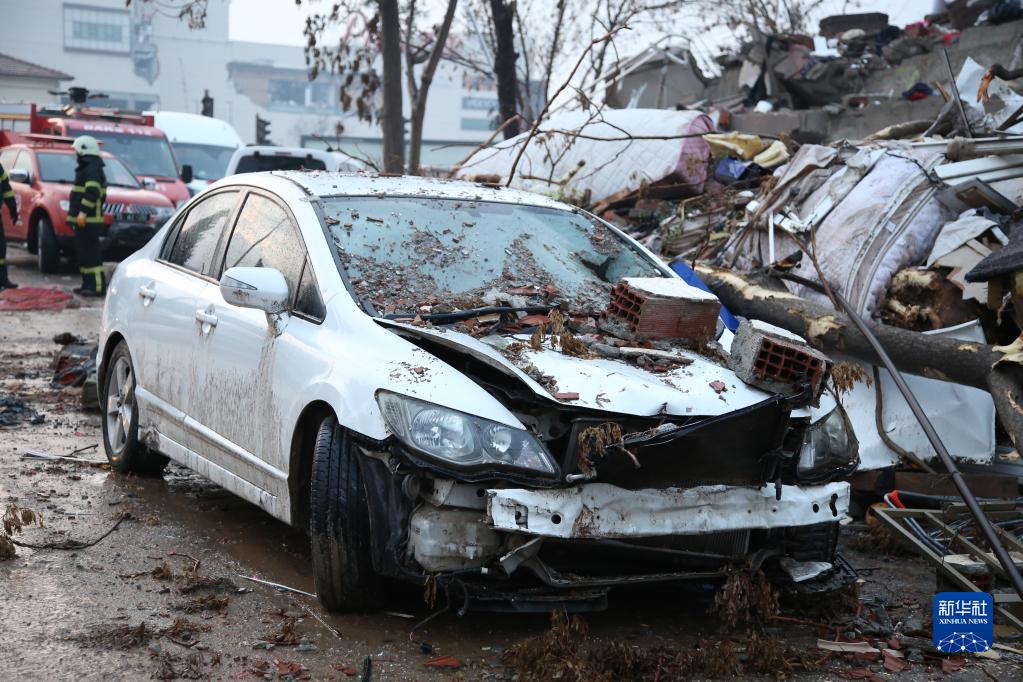 2月7日在土耳其南部卡赫拉曼馬拉什市市中心拍攝的受損的汽車。卡赫拉曼馬拉什市是本次地震重災區卡赫拉曼馬拉什省省會,是遭受地震破壞最為嚴重的城市之一。