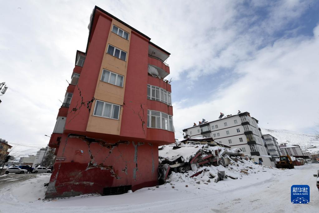 這是2月7日在土耳其卡赫拉曼馬拉什省的埃爾比斯坦地區拍攝的地震中受損的建筑物。