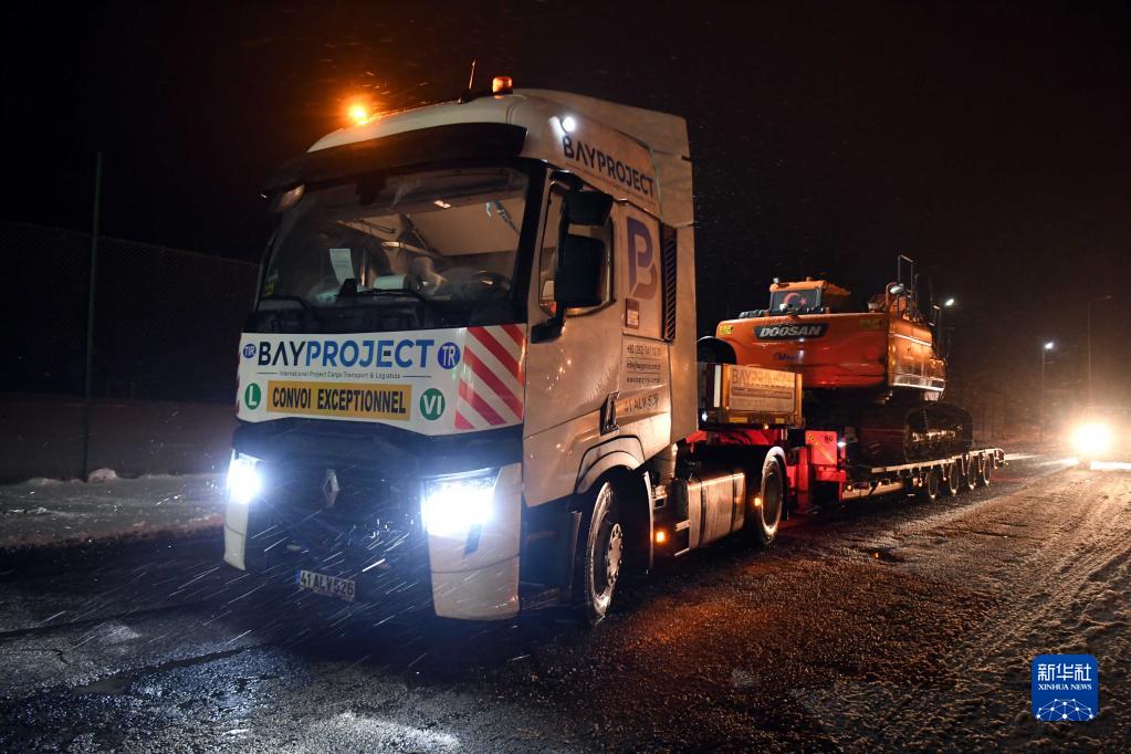 這是2月6日晚在土耳其伊斯坦布爾至安卡拉公路上拍攝的運往災區的大型機械。