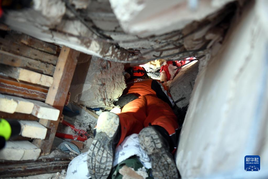 2月8日,中國救援隊隊員在土耳其哈塔伊的一處地震廢墟搜救。