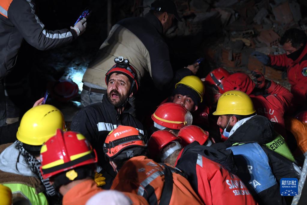 2月11日,包括中國救援隊隊員在內的救援人員在土耳其哈塔伊省安塔基亞市參與搜救。
