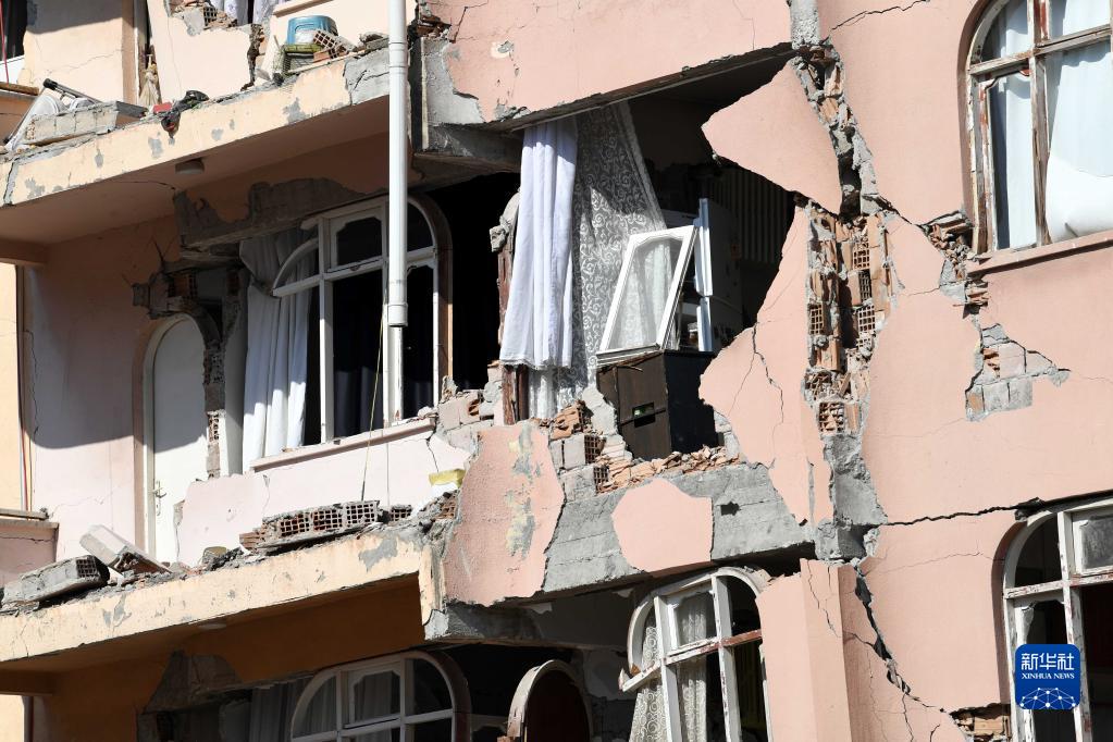 這是2月14日在土耳其哈塔伊省安塔基亞市拍攝的因地震損毀的建筑物。