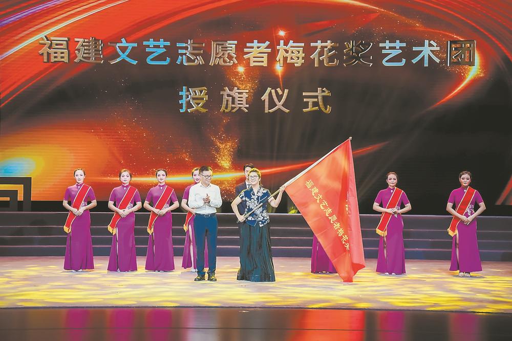 1日,省文聯(lián)向福建文藝志愿者梅花獎(jiǎng)藝術(shù)團(tuán)授旗。省劇協(xié)供圖