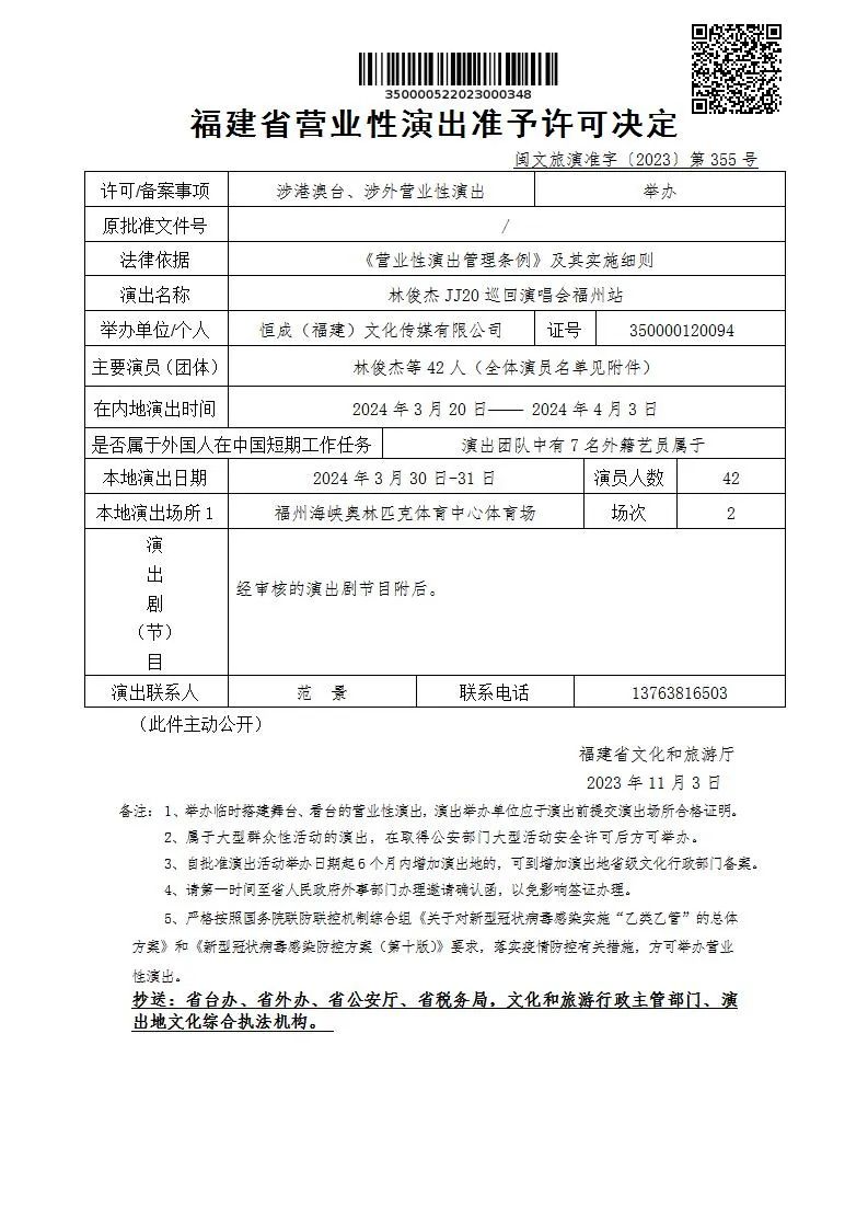11月7日,福建省文化和旅游廳網站發布福建省營業性演出準予許可決定。
