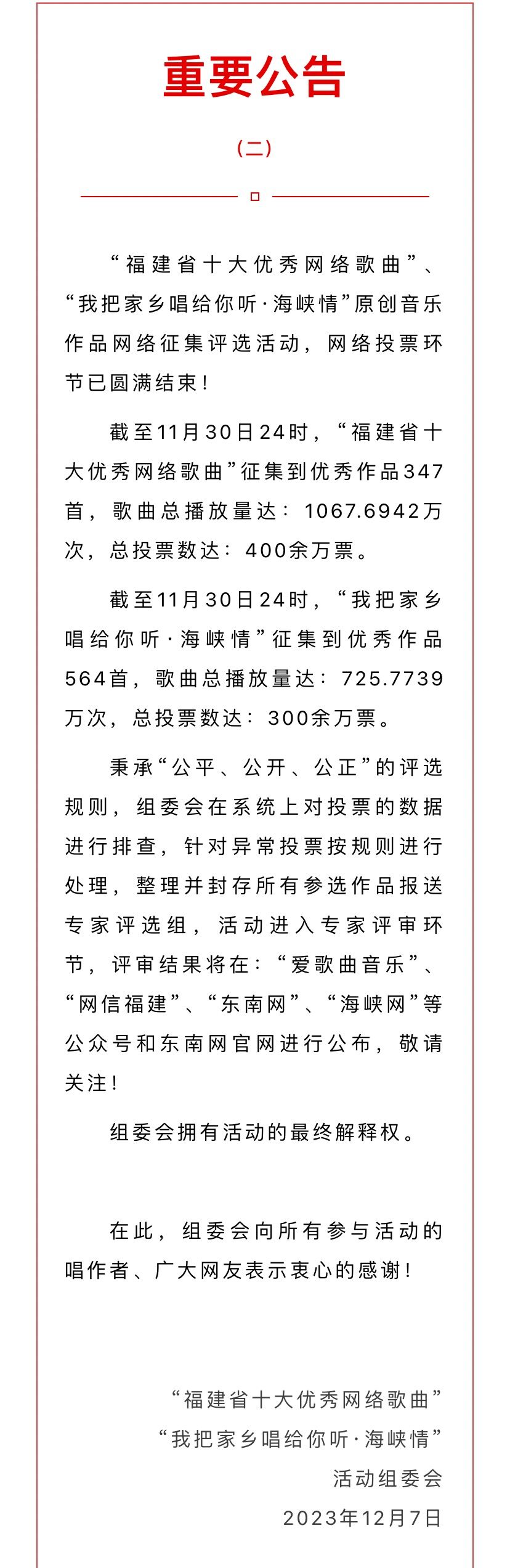今日,“我把家鄉(xiāng)唱給你聽”活動組委會發(fā)公告,“福建省十大優(yōu)秀網(wǎng)絡(luò)歌曲”、 “我把家鄉(xiāng)唱給你聽·海峽情”原創(chuàng)音樂作品網(wǎng)絡(luò)征集評選活動,網(wǎng)絡(luò)投票環(huán)節(jié)已圓滿結(jié)束!活動將進入專家評審環(huán)節(jié),評審結(jié)果將在“愛歌曲音樂”、“網(wǎng)信福建”、“東南網(wǎng)”、“海峽網(wǎng)”等公眾號和東南網(wǎng)官網(wǎng)進行公布。