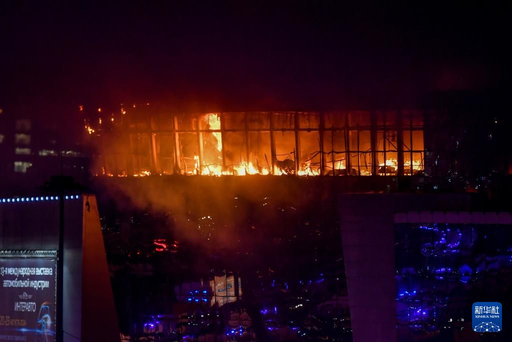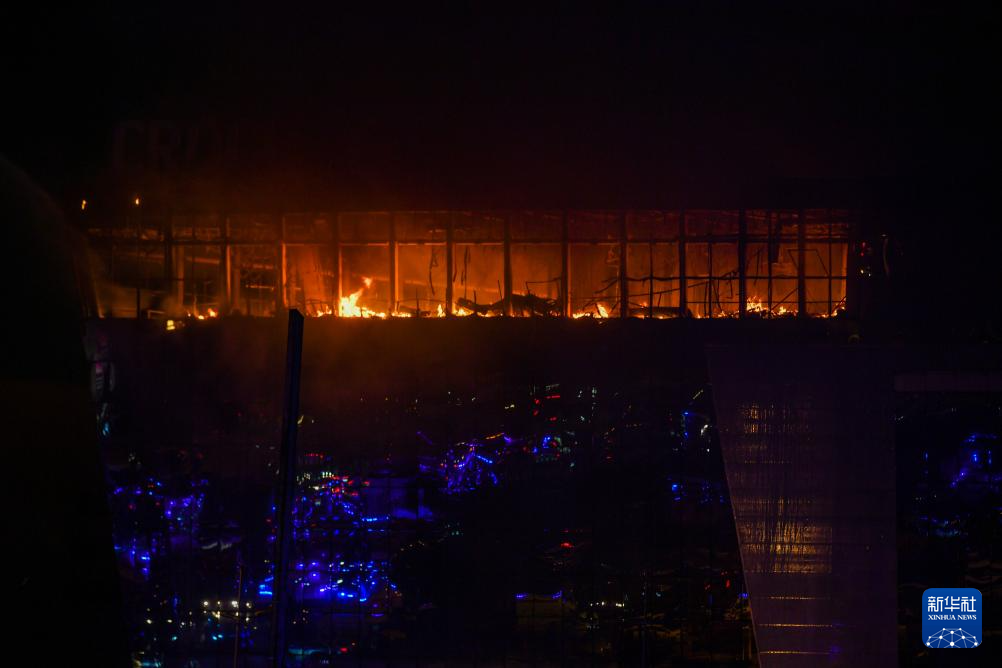 3月22日,俄羅斯莫斯科近郊克拉斯諾戈爾斯克市一音樂廳發生槍擊事件后引發火災。 克拉斯諾戈爾斯克市一音樂廳22日發生槍擊事件。據俄羅斯聯邦安全局初步統計,這起槍擊事件已造成40人死亡、100多人受傷。 新華社記者 曹陽 攝