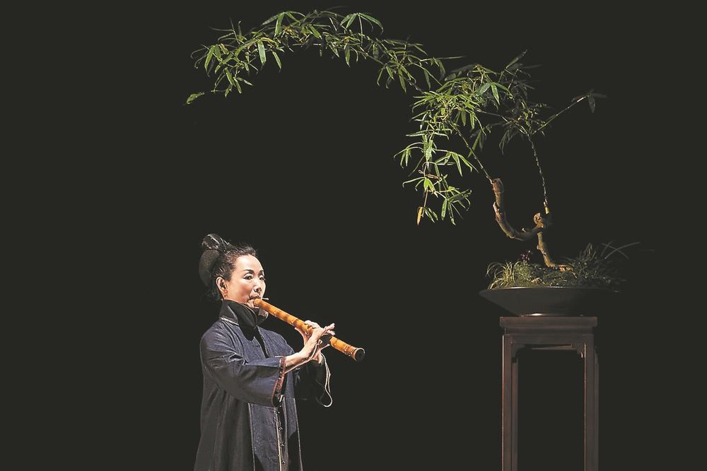 一把木椅、一只花幾、幾張屏風,四周點綴著芭蕉、翠竹和楓葉荻花。臺灣知名古琴演奏家李孔元的一曲《春曉吟》音落,王心心一身素衣,一支素簪將長發挽作發髻,吹著洞簫,從屏風后緩緩走出。隨著她的登臺,舞臺場景如同一幅典雅的仕女圖在觀眾面前徐徐展開(上圖)。