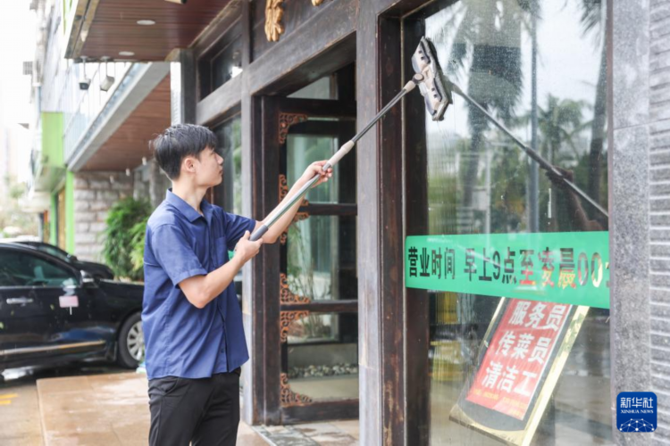 9月7日,在海口市四東路,一家餐館的工作人員在打掃衛(wèi)生。