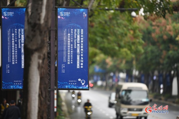 2024年11月17日,浙江烏鎮,道路兩旁已懸掛起2024年世界互聯網大會烏鎮峰會宣傳道旗。(光明網記者 潘迪攝/光明圖片)