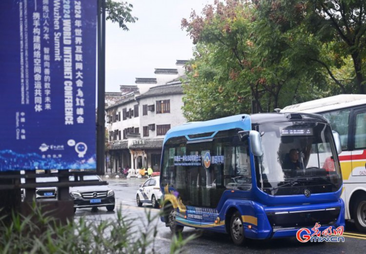 2024年11月17日,浙江烏鎮,路上行駛的車路云一體化自動駕駛巴士。(光明網記者 潘迪攝/光明圖片)