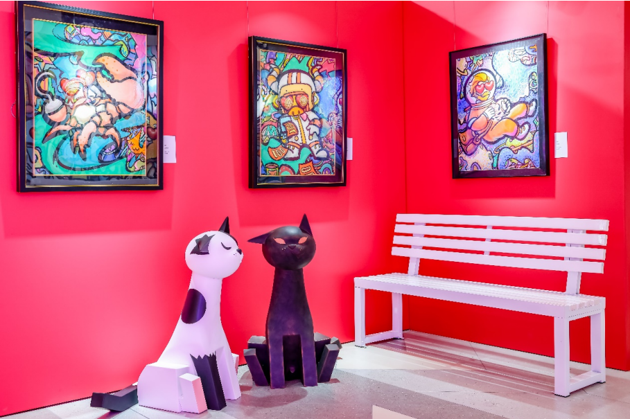 據悉,“BE LOVED & BE RICH”由萬達電影董事長兼總裁陳祉希策展,藝術家歪歪、陳建周、張超級、任萌等共同參與。現場70件作品,既沉淀了傳統民俗的吉祥文化,也包含先鋒、時尚、機甲等元素,詮釋著當代年輕人的希冀、愛和遐思。本次展覽為期三個月,來訪游客均可免費參觀。