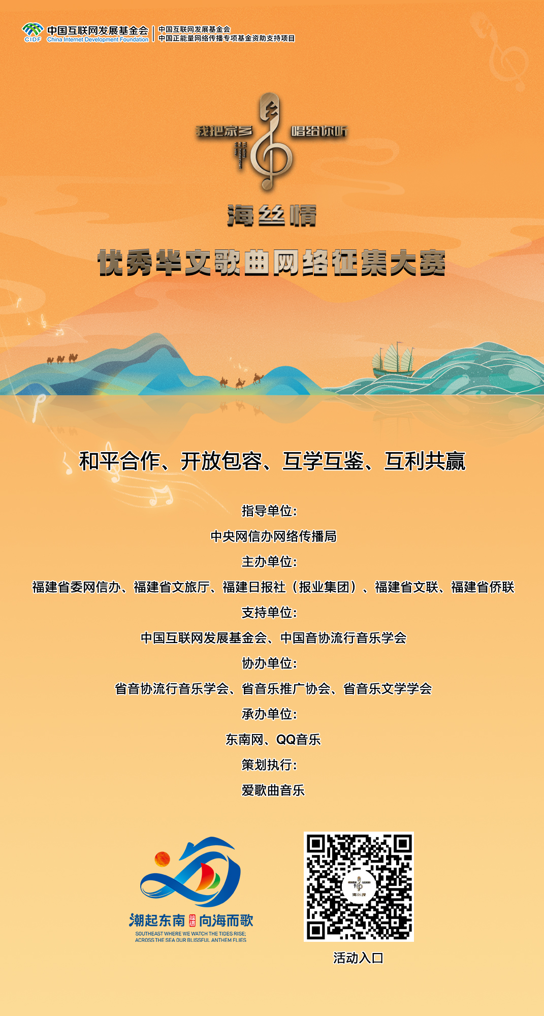 “海絲情·我把家鄉唱給你聽”優秀華文歌曲網絡征集大賽正在進行中,參賽的音樂人不斷增多,作品形式風格多樣。山戀海,海戀山,山海相戀本共情。 大賽組委會每周都將從中挑選出優秀作品,在東南網、海峽網等多個官方平臺進行展播,并在抖音、視頻號、QQ音樂等平臺,用媒體官方號、組委會官方號全方位推送展示。 為了能讓更多人欣賞到你的作品,請認真填寫報名表,有歌曲視頻MV的,展播優先。 “海絲情·我把家鄉唱給你聽”優秀華文歌曲網絡征集大賽,由中央網信辦網絡傳播局指導,福建省委網信辦、福建省文旅廳、福建日報社(報業集團)、福建省文聯、福建省僑聯等主辦。活動得到了中國互聯網發展基金會中國正能量網絡傳播專項基金資助支持。