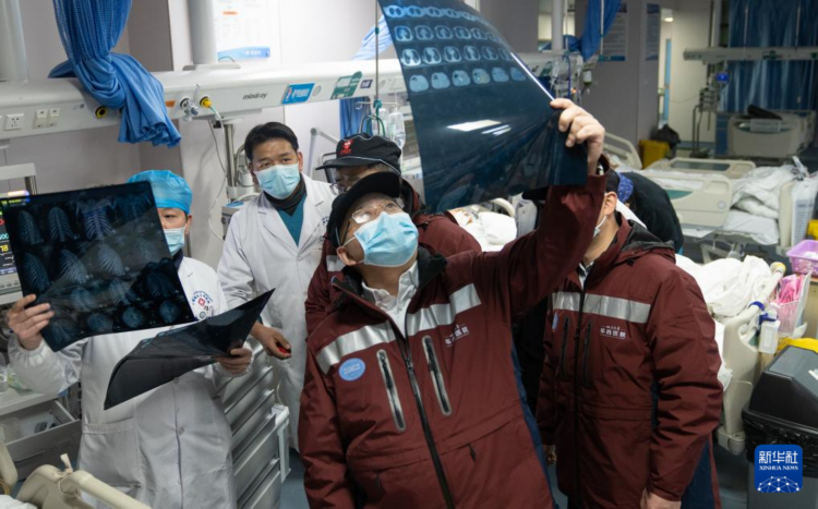 1月7日夜,在日喀則市人民醫院,前來增援的四川大學華西醫院醫療隊隊員(紅衣)和西藏當地醫生一起查看地震受傷人員病情。