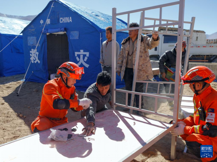 1月8日,在日喀則市定日縣措果鄉雪珠村安置點,林芝市森林消防支隊米林中隊的救援人員幫助受災群眾安裝領取到的床。新華社記者 沈伯韓 攝