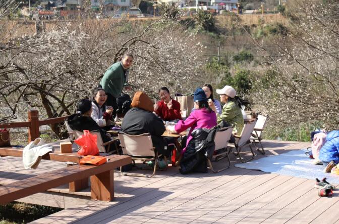 此外,在會場外的梅林中,處處都是游客們的身影,他們聞香而來,感受著冬日的愜意時光,或駐足觀賞,或拍照留念。不少游客更是在梅樹下搭起露營帳篷,與大自然來個親密接觸。