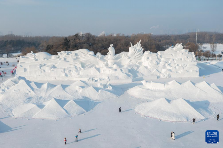 1月6日,在哈爾濱太陽島雪博會園區,游客觀賞本屆雪博會主塑《雪艷春》(無人機照片)。《雪艷春》以“百鳥朝鳳”為靈感源泉,鳥與梅花元素相互交織,長100米,高30米。