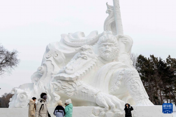 1月13日,在哈爾濱太陽島雪博會園區,游客在大型雪雕《悟空歸來》前游覽。