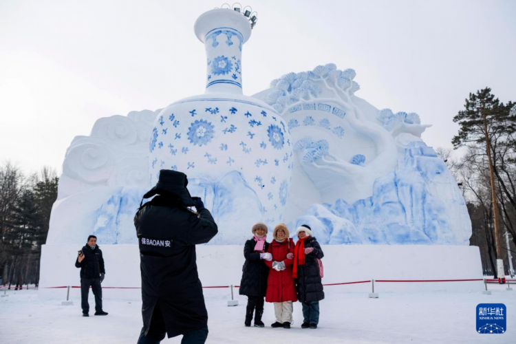1月13日,在哈爾濱太陽島雪博會園區,游客在大型雪雕《雪韻國粹青花瓷》下留影。