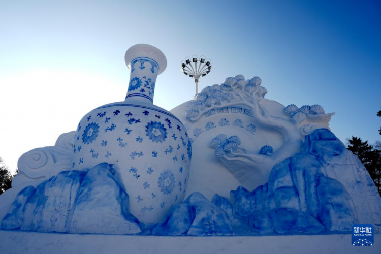 這是1月11日在第37屆太陽島國際雪雕藝術博覽會上拍攝的雪雕作品《雪韻國粹青花瓷》。