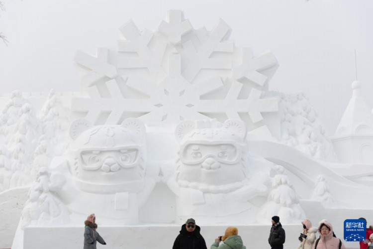1月5日,在哈爾濱冰雪大世界園區,游客在亞冬會吉祥物雪雕旁游玩、拍照。