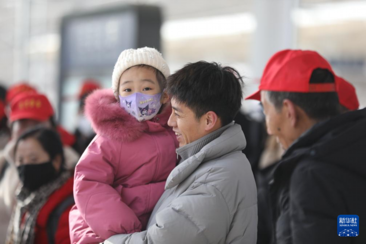 2月7日,甘肅省定西市外出務(wù)工人員抱著孩子在站臺上等候。