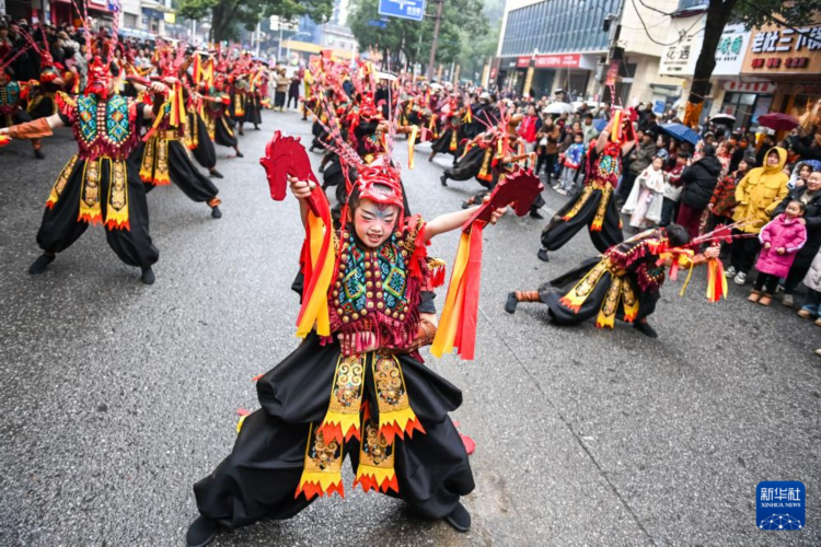 2月12日,在張家界市永定區(qū),當?shù)孛耖g文藝隊演員在表演民俗節(jié)目。