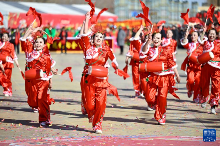 2月12日,社火隊伍在位于寧夏銀川市的中國花卉博覽園表演。