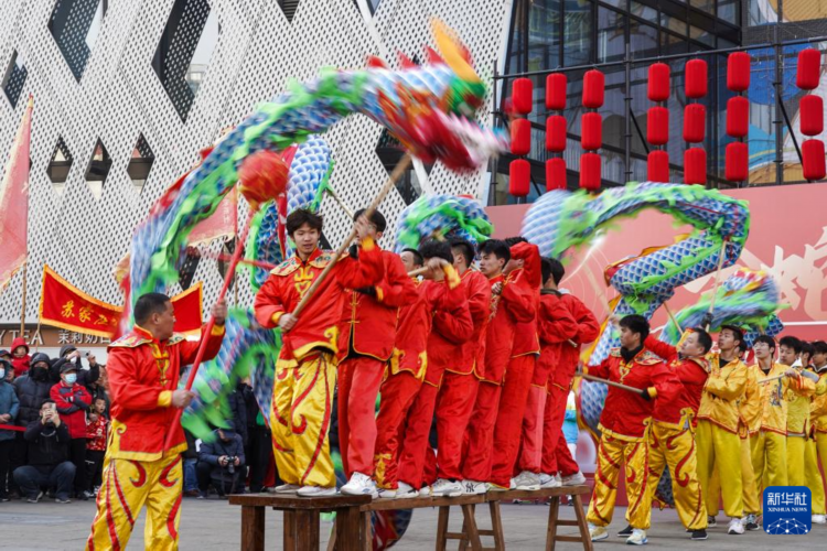2月12日,演員在“金蛇迎春”濟南市元宵節傳統舞蹈展演活動中表演舞龍。