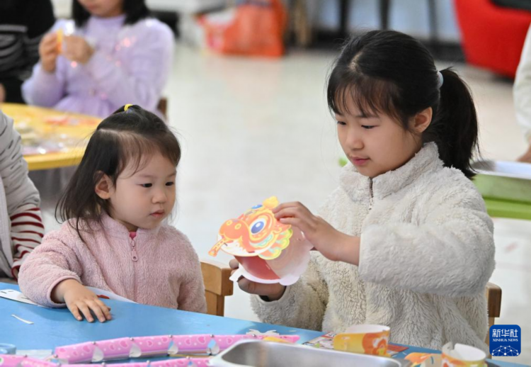 2月12日,小朋友在天津市動物園科普館制作花燈。